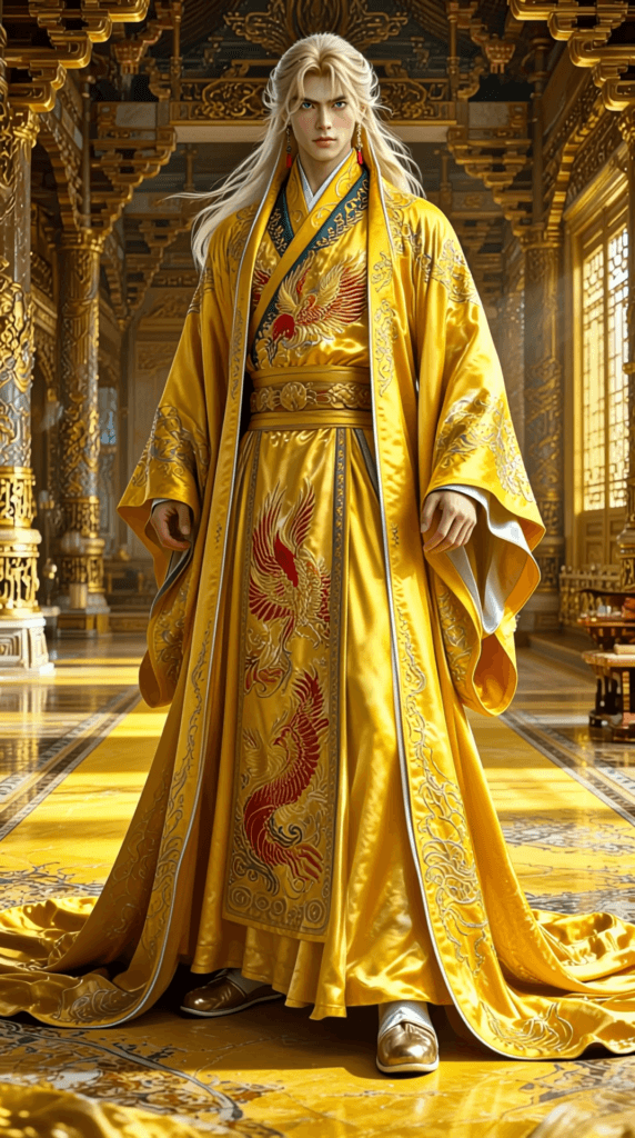 Architecture: Curved roofs with red glazed tiles, golden columns, lotus lakes, and pavilions adorned with the finest Shanlu silk. Each banner bears the image of a phoenix on a yellow background.